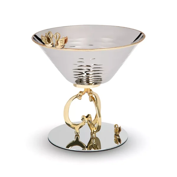کاسه آجیل استیل و برنج قو با طراحی متقارن و ساختاری ظریف، انتخابی مناسب برای سرو آجیل و تنقلات در پذیراییهای رسمی است.