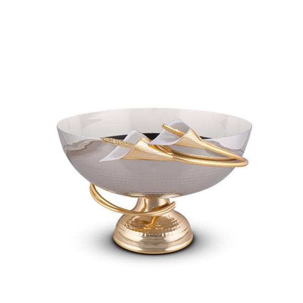 بدنه نیمهچکشی جلوهای درخشان ایجاد میکند و پایه برنجیِ طرح گل شیپوری، ظرف را از سطح میز بالاتر نگه میدارد و ظاهر آن را باشکوهتر میکند.