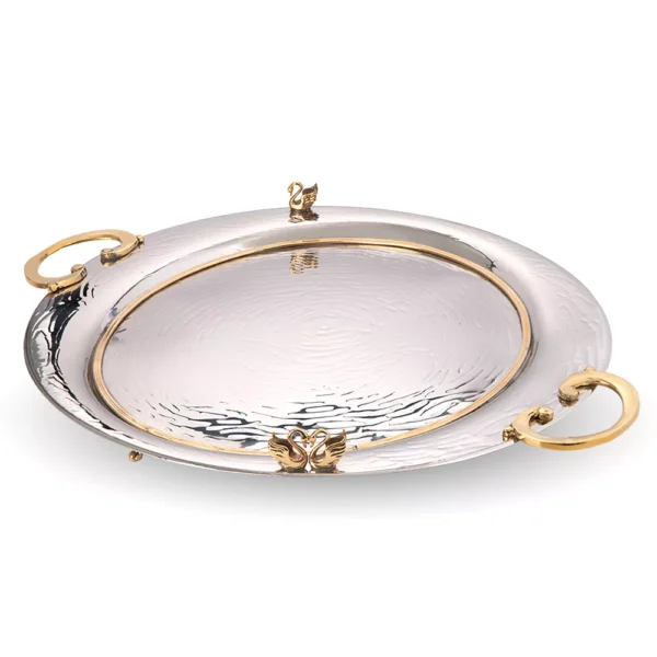 سینی گرد استیل و برنج قو با طراحی متقارن و فرم دایره‌ای، انتخابی مناسب برای سرو چای، نوشیدنی و پذیرایی‌های رسمی است.