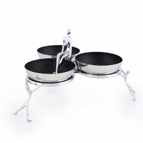اُردوخوری سهپیاله ژستو مدل GES-08 با طراحی فیگوراتیو و بدنه برنج آبکاریشده نیکل و کروم، یک محصول لوکس و خاص برای سرو انواع تنقلات، آجیل، زیتون، مزه و خوراکیهای پذیرایی است.