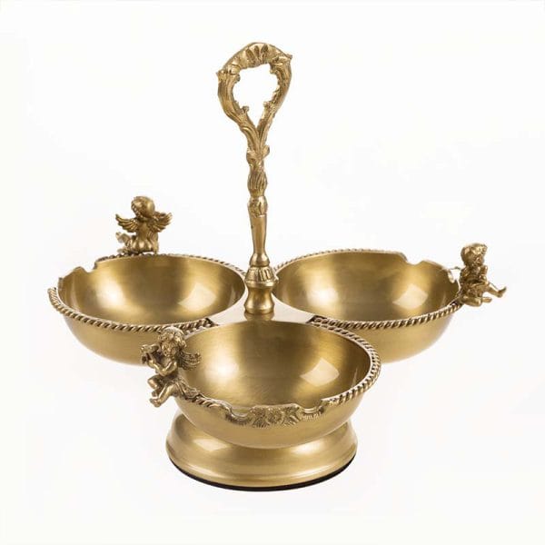 اردو سه‌پیاله پایه‌دار برنجی کویین مدل AQ7714 یک ظرف پذیرایی کاربردی برای سرو انواع پیش‌غذا، تنقلات و مخلفات در مهمانی‌ها و چیدمان میز پذیرایی است. طراحی سه‌پیاله و پایه‌دار، امکان چیدمان مرتب چند بخش خوراکی را فراهم می‌کند و ظاهری منظم به میز می‌دهد.