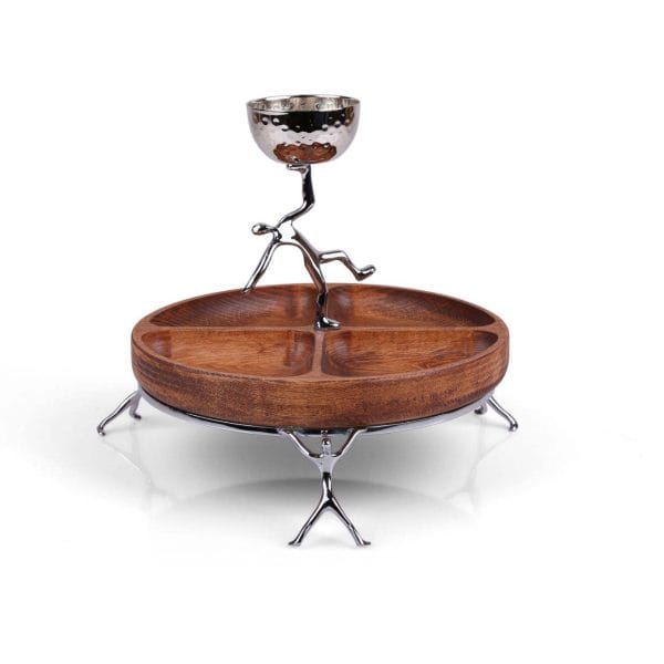 سینی اصلی دارای ۴ محفظه مجزا برای سرو انواع مزه، تنقلات و آجیل است و ظرف بالایی نیز برای سرو سس، میوه خشک یا تزئینات کاربرد دارد.