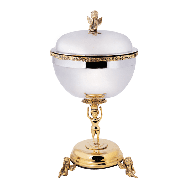 شکلاتخوری استیل و برنج تیارا مدل TI 4444 با طراحی خاص، پایهدار و دربدار، ترکیبی از ظرافت دستساز و درخشش فلز برنج است.