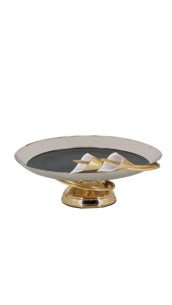 گل شیپوری دستساز روی بدنه، در کنار ترکیب طلایی و نقرهای، ظاهر ظرف را برجسته و مناسب دکور و پذیرایی رسمی میکند.