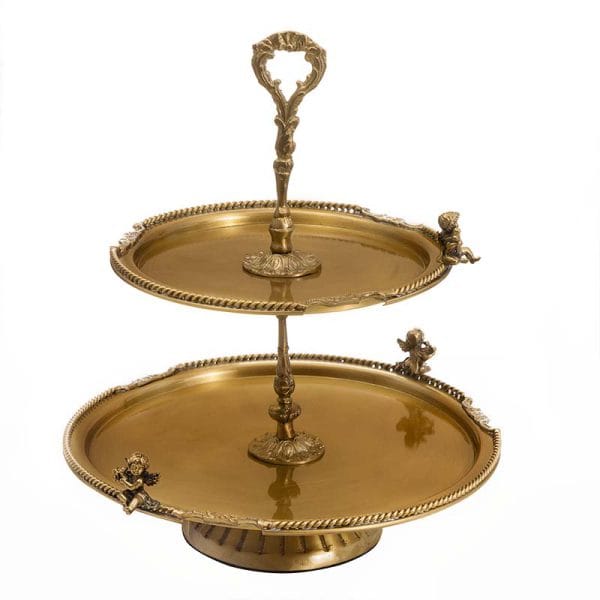 شیرینیخوری دوطبقه برنجی کویین مدل AQ7712 یک ظرف پذیرایی کلاسیک برای سرو انواع شیرینی و استفاده در چیدمان میز پذیرایی است.
